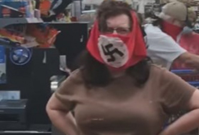 En redes sociales fue difundido un video que muestra a una pareja haciendo las compras en el supermercado usando cubrebocas con la bandera nazi.