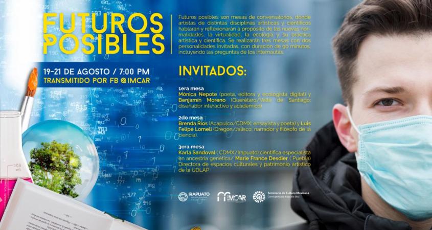 ‘Futuros Posibles’, son las mesas de conversatorios, en las que participarán artistas de distintas disciplinas y científicos, que reflexionarán sobre la nueva normalidad, virtualidad, ecología y la práctica artística y científica, durante la pandemia por Covid-19.