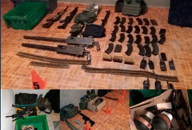 La orden de cateo a un inmueble de esta localidad fue ordenado por un Juez de Oralidad, quien permitió asegurar 9 chalecos balísticos, 6 armas largas, 2 ametralladoras antiaéreas, cientos de cartuchos de diversos calibres, uniformes, aproximadamente 2.5 kilos de marihuana, entre otros objetos.