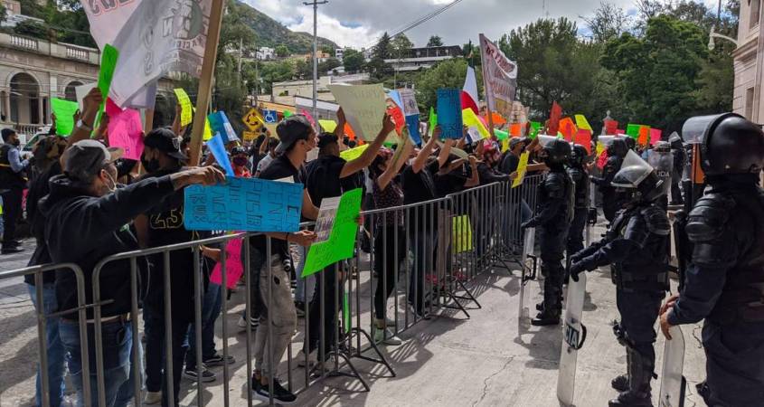 Cerca de las 10:00 de la mañana, los manifestantes arribaron al Palacio de Gobierno, que ya resguardaban con mallas y agentes antimotines, donde pidieron dialogar con el gobernador Diego Sinhue Rodríguez Vallejo sobre la regularización de los centros.