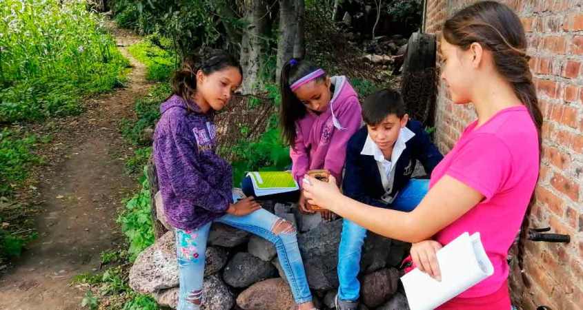 A unos 17 kilómetros al norte de la cabecera municipal, a la orilla de la carretera de la comunidad El Estanco, se observa como Angélica Robles Cabrera, estudiante de tercer grado del SABES de esa comunidad, presta su teléfono y ayuda a su hermano Alonso y sus vecinitas Fátima y Monserrat del primer grado de la telesecundaria 655 de la comunidad de La Campana para que reciban sus clases.