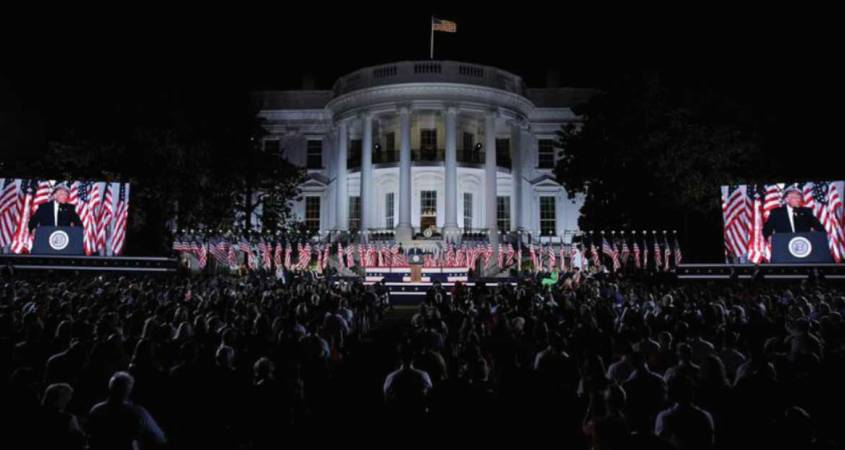 El cierre de la convención republicana –y, por tanto, el pistoletazo definitivo al esprint final hasta las elecciones del 3 de noviembre fue una oda absoluta a un Trump que se erigió como transfiguración del Estado, líder absoluto y capaz de abusar de su poder y su cargo para hacer lo que se le antoje. Para su gran fiesta, una celebración que se autoregaló para agasajarse, convirtió la Casa Blanca en un escenario de campaña.