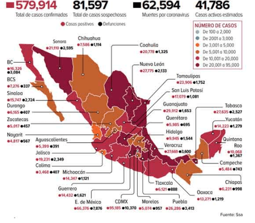La Secretaría de Salud (Ssa) detalló que 579 mil 914 son los casos acumulados confirmados de coronavirus, con la ocurrencia de seis mil 26 nuevos contagios.