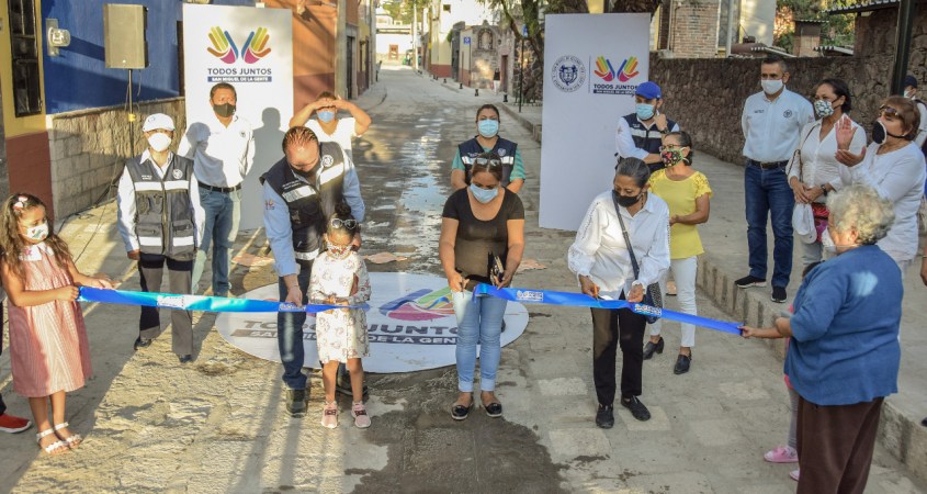 La dirección de Infraestructura y Obras Públicas intervino en la pavimentación con adoquín tipo San Luis del arroyo de calle que comprende un área de 733.77 metros cuadrados y la rehabilitación tanto de banquetas como guarniciones con el mismo material. Se sumaron acciones de colocación de señalamientos de tránsito, luminarias, bolardos, poda de árboles, así como el aplanado y pinta de fachadas de todas las viviendas.