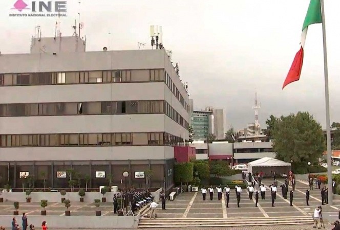 Con sana distancia en la explanada del Instituto se izó la bandera y se cantó el himno nacional con la presencia sólo de integrantes Consejo General, consejeros y directores de área.