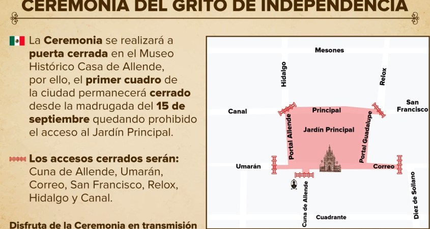 Con motivo de la contingencia a causa de la pandemia por coronavirus, la ceremonia del Grito de Independencia se realizará a puerta cerrada; desde la madrugada del 15 de septiembre quedará prohibido el acceso al primer cuadro de la ciudad.