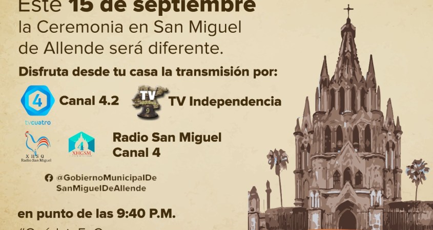 Las y los sanmiguelenses podrán seguir la ceremonia del Grito de Independencia desde casa; la transmisión iniciará a las 9:40 pm y culminará a las 10:30 pm con un espectáculo de fuegos pirotécnicos que podrá apreciarse desde distintos puntos de la ciudad.