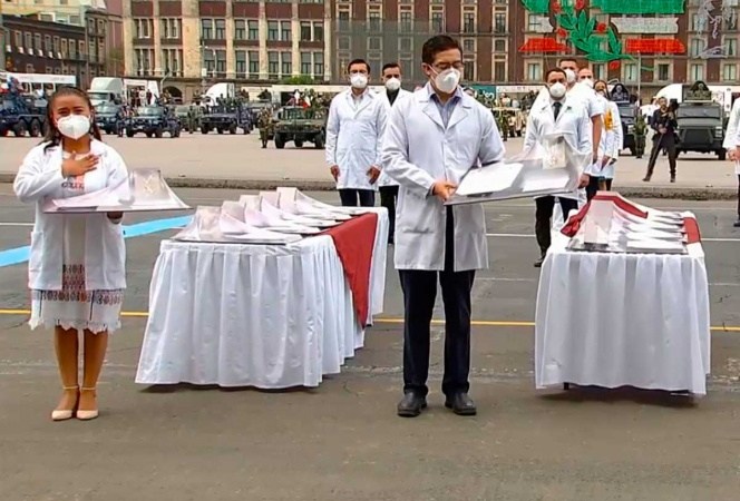 Previo al desfile militar por el 210 aniversario del Día de la Independencia, el presidente Andrés Manuel López Obrador condecoró con la presea «Miguel Hidalgo» a 58 elementos del sector salud por su trabajo ante la pandemia por Covid-19 en el país.