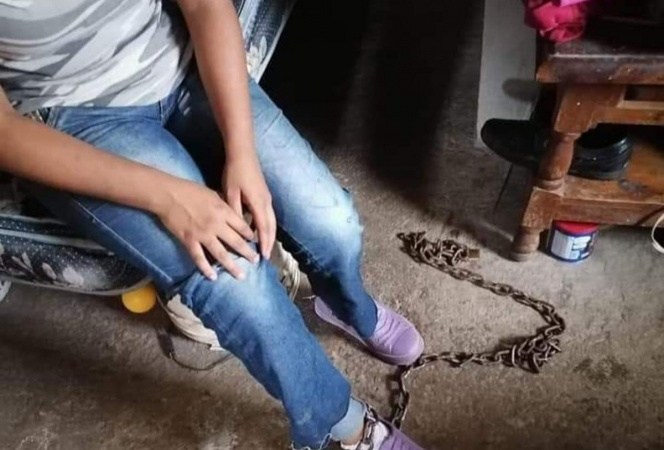 La víctima dio a conocer que su mamá la tenía así para que no saliera de casa. Un extremo de la cadena estaba empotrada al piso y el otro al tobillo.
