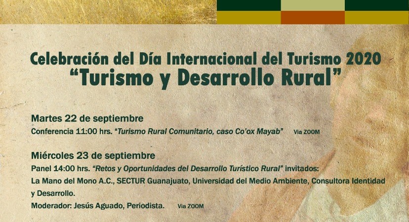 El martes 22 de septiembre, se inició la celebración con la conferencia “Turismo Rural Comunitario, caso Co’ox Mayab” en la que participaron 90 personas, vía Zoom, y se registraron más de mil impresiones. El día de ayer se presentó “Retos y Oportunidades del Desarrollo Turístico Rural”, los invitados: La Mano del Mono A.C., SECTUR Guanajuato, Universidad del Medio Ambiente y la Consultora Identidad y Desarrollo.