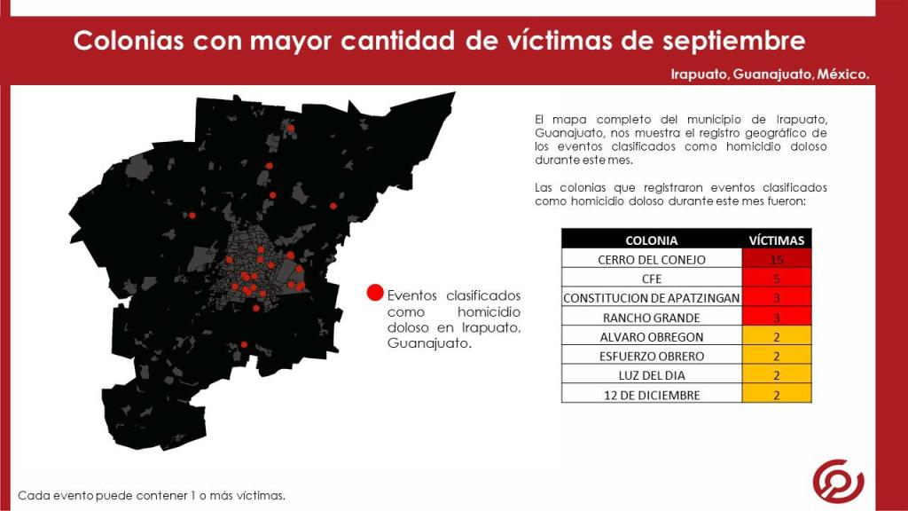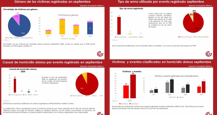 El reporte mensual de víctimas por homicidio doloso presenta la información condensada del registro de víctimas y eventos acontecidos en el municipio de Irapuato, Guanajuato.