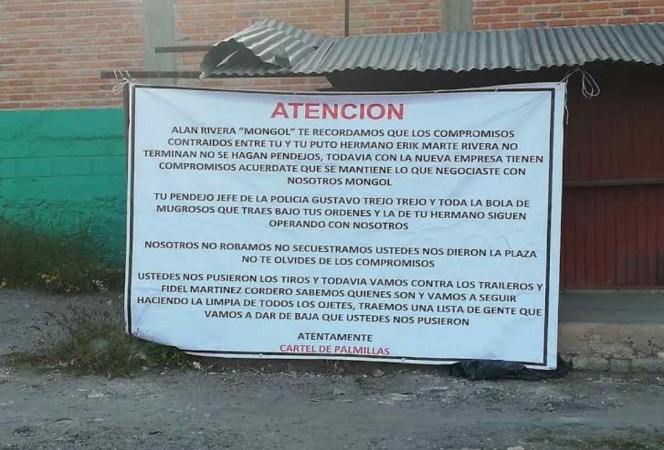 La manta contenía mensajes en contra del candidato del PAN a alcalde de Zimapán, Alan Rivera Villanueva, y se atribuyó al Cártel de Palmillas.