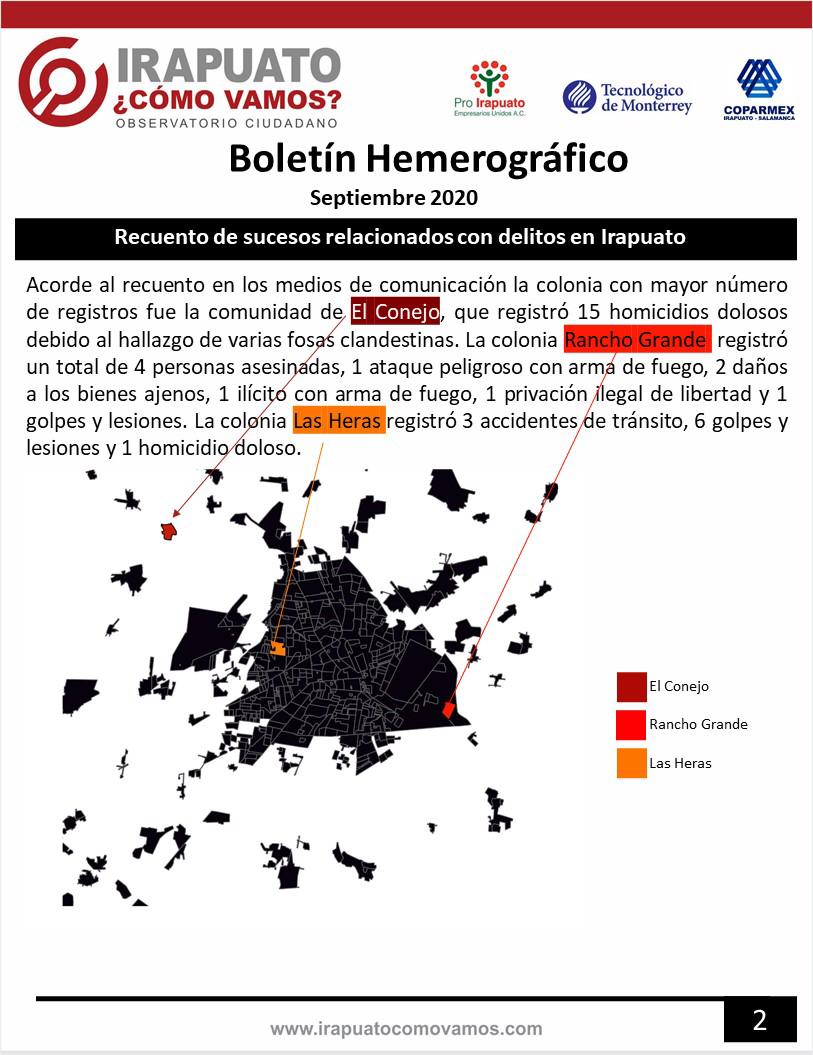 Durante el mes de septiembre se registró en medios de comunicación que 51 personas perdieron la vida clasificadas en homicidio, 48 en doloso y 3 en culposo, acorde al comparativo con lo registrado en el mes de agosto 2020, en homicidio doloso tuvimos un aumento en el número de víctimas de un 300%, mientras que el homicidio culposo registro cifras iguales al mes de agosto 2020.