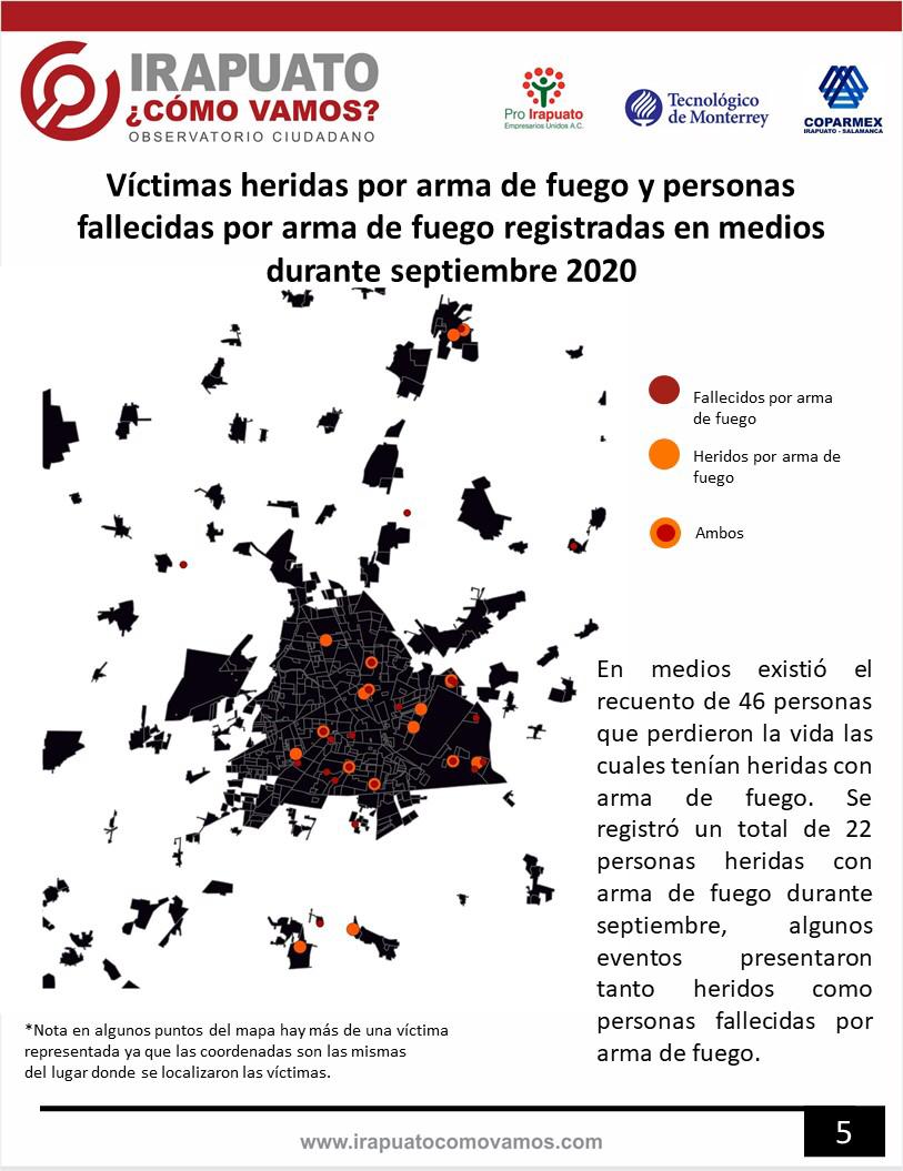 De estos registros, las víctimas por homicidio doloso fueron las que mayor cantidad registraron siendo 46 víctimas, se registró 22 personas con lesiones producidas por arma de fuego, 7 registros relacionados con robos, 10 con la portación ilegal y disparos con arma de fuego, hubo recuento de 6 sucesos más donde estuvo presente arma de fuego.