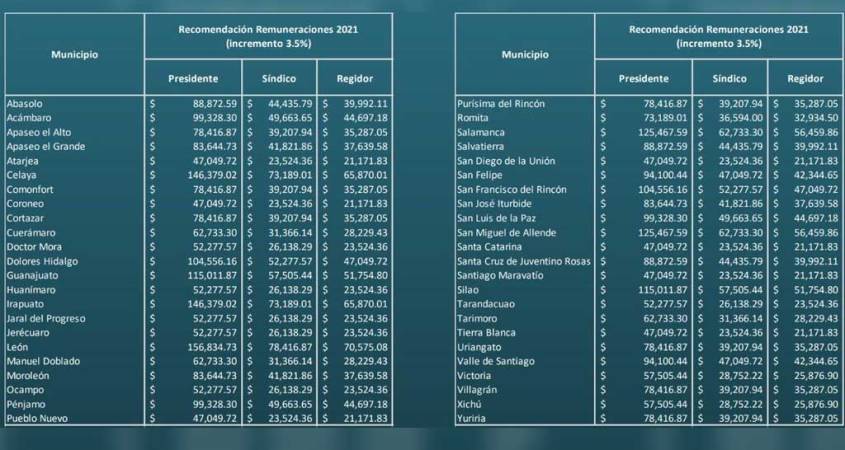 También hay casos donde los presidentes municipales perciben menor remuneración que lo recomendado, tal es el caso de Irapuato y Celaya, por mencionar algunos.