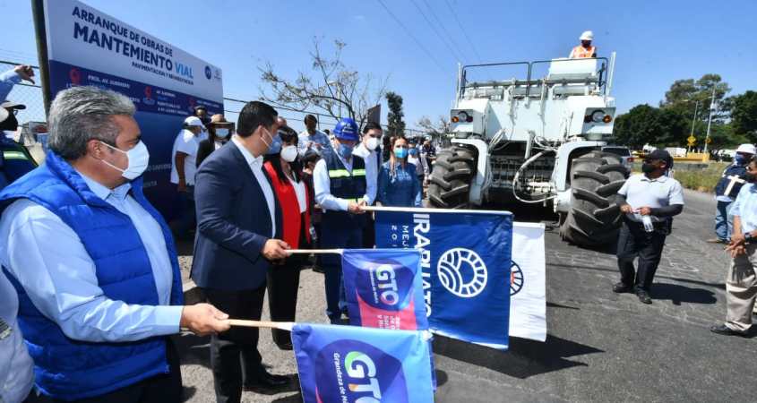El presidente municipal, Ricardo Ortiz Gutiérrez, junto al gobernador del Estado, Diego Sinhue Rodríguez Vallejo, dio el banderazo de arranque del programa en vialidades, que conectan con el Segundo y Tercer Cinturón Vial.
