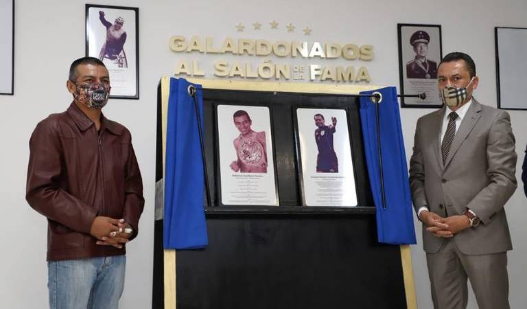 El boxeador Robinson Castellanos y el árbitro internacional Germán Arredondo, forman parte del Salón de la Fama del Deporte Celayense, luego de que este martes quedaron inscritos sus nombres y develadas las placas conmemorativas, en el recinto.