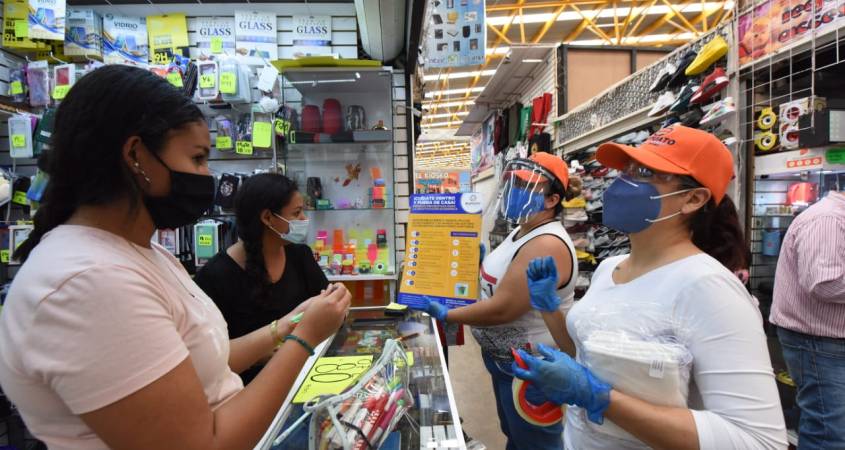 Integrantes de las brigadas ‘Unidos vs Covid’, visitaron los establecimientos de la Plaza del Comercio Popular, para verificar la aplicación de medidas preventivas para el cuidado de sus consumidores.