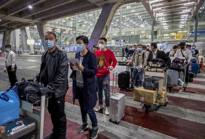 Un avión de 39 turistas chinos llegó al aeropuerto Suvarnabhumi de Bangkok el martes por la noche desde Shanghai y fue recibido por el personal, que llevaba trajes de protección completa.