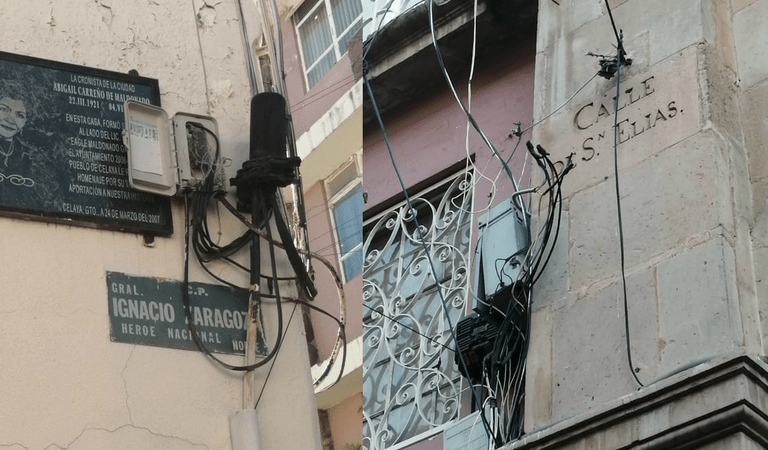 El Sol del Bajío hizo un recorrido y se apreciaron diversas anomalías, de inicio en el jardín principal, en la esquina de portal Guerrero y Corregidora, fueron instalados cableados telefónicos sobre y a un costado de la antigua nomenclatura de cantera de la calle de San Elías, hoy Corregidora, que tiene más de dos siglos.