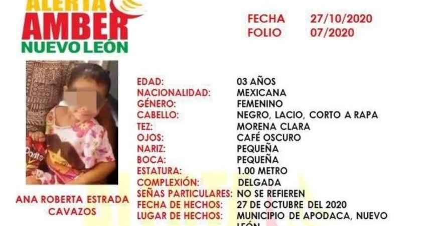 La pequeña Ana Roberta Estrada Cavazos de tres años fue encontrada sin vida este miércoles luego de haber sido reportada como desaparecida el 27 de octubre en el municipio de Apodaca.