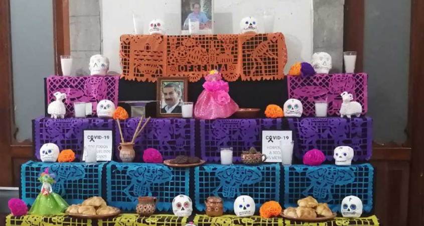Este año el altar de muertos colocado en las oficinas de la Presidencia municipal está dedicado a las personas fallecidas por el Covid-19, así como también a trabajadores de la administración municipal y de CMAPAS que han perdido la vida en los últimos meses y años.