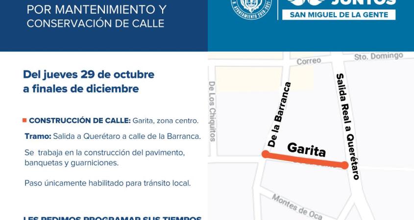 La dirección de Infraestructura y Obras Públicas, a través del departamento de Bacheo y Trabajos Especiales informa a vecinos de la calle Garita que, a partir del jueves 29 de octubre y durante los siguientes dos meses, la vialidad será cerrada para su rehabilitación.