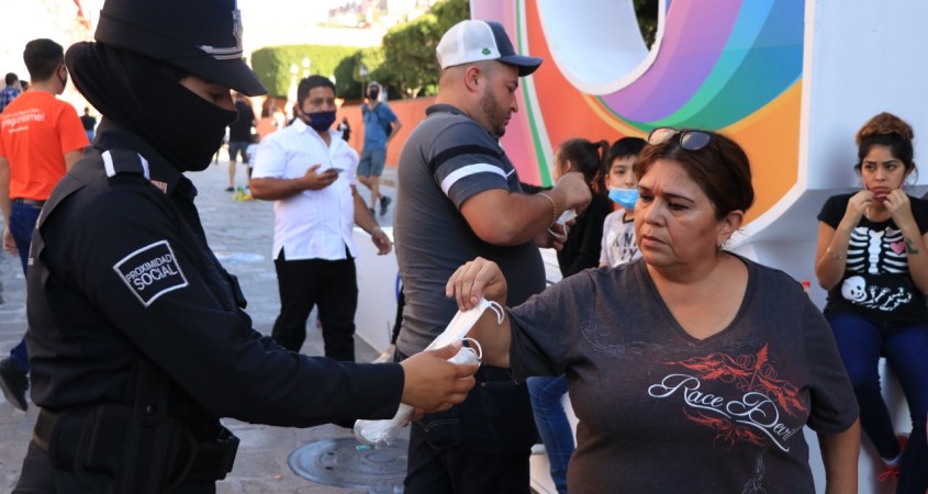 A partir de las 8:30 de la mañana, 8 oficiales mujeres de Tránsito y Policía Municipal recorren el Jardín Principal y sus alrededores para supervisar que los transeúntes tengan puesto su cubrebocas y, a quienes no portan uno, se lo proporcionan para que puedan cumplir con lo establecido en el Bando Municipal, que señala el uso obligatorio de este elemento en San Miguel de Allende.