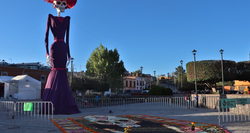En el Parque Juárez, el busto de una catrina de tres metros de altura, fue instalada en los pasillos. La calavera con coloridas flores en el cráneo, una dentadura casi perfecta y aretes sanmiguelenses conmemora a nuestros seres fallecidos en este Día de Muertos.