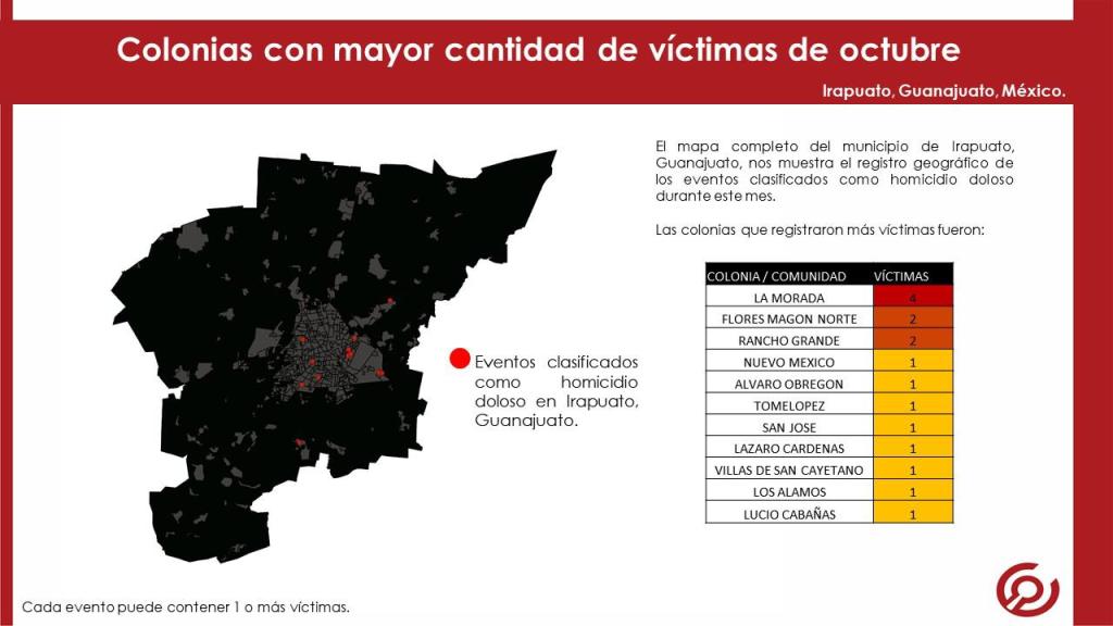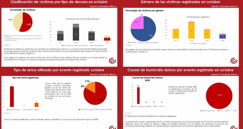 El reporte mensual de víctimas por homicidio doloso presenta la información condensada del registro de víctimas y eventos acontecidos en el municipio de Irapuato, Guanajuato. Los datos que destacaron en el reporte de octubre 2020: