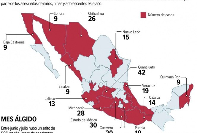 Por mes, julio fue el periodo en el que ocurrieron más homicidios de niñas, niños y adolescentes, con 50 casos; seguido de los meses de abril, agosto y septiembre, con 39 asesinatos en cada uno.