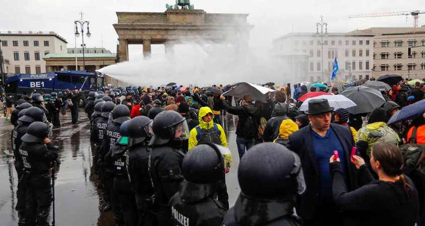Poco antes, la policía había ordenado la disolución de esta concentración de entre 5 mil y 10 mil personas, cerca de la puerta de Brandemburgo, en el corazón de la capital alemana, tras haberles instado sin éxito a que respetaran las medidas sanitarias.
