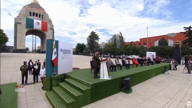 En el evento para conmemorar el 110 aniversario del inicio de la Revolución Mexicana, celebrado en la Plaza de la República, el líder militar además defendió la participación del Ejército en los proyectos de desarrollo del país y recordó que forman parte de su misión por ley.