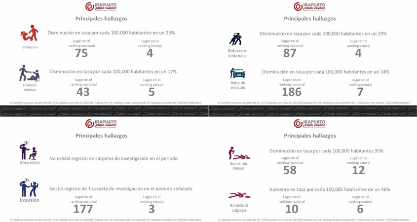 En el caso de Irapuato, se registró una tasa de 8.15 homicidios dolosos por cada 100,000 habitantes lo cual indicó una disminución respecto al mismo periodo, pero del 2019 de un 35%.