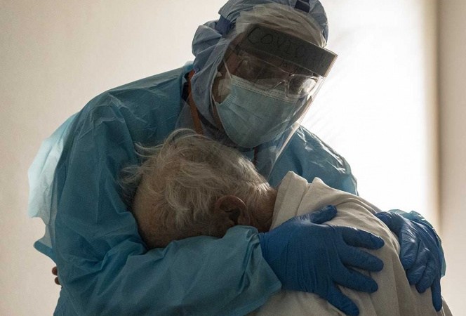 «Estaba llorando»: la foto de un médico estadunidense con guantes, tapabocas y visera abrazando a un paciente anciano se volvió viral en las redes sociales, símbolo de la desesperación de las víctimas del covid-19 y la compasión de los trabajadores de la salud.