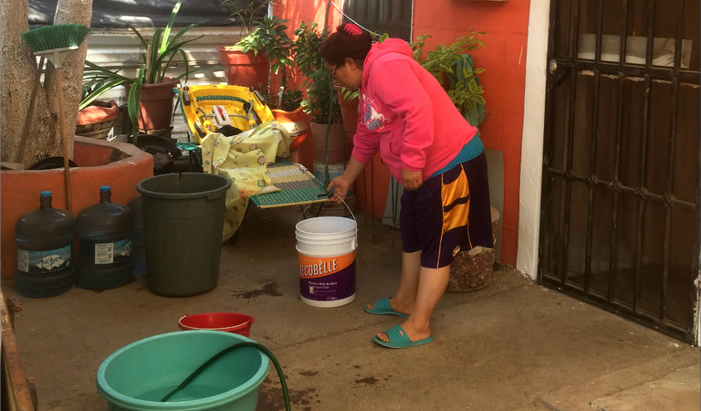 Mientras tanto en la casa de la presienta de colonos optaron por llenar su tinaco con cubetas, ya que en el sanitario se gasta menos con sus depósitos que con las cubetas ya que si de por si no hay la tienen que cuidar.
