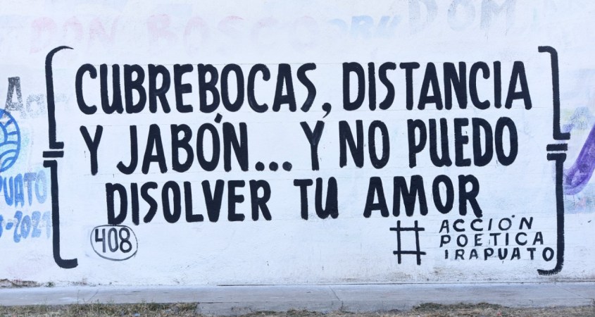 “En este barrio nos cuidamos y usamos gel a diario”, “Mi amor por ti es exponencial y el cubrebocas esencial”, “No quiero oro, ni quiero plata, yo lo quiero es que te quedes en casa” y “Con el Cubreboca, Con dios y Con la Trinca” son algunas de las frases que jóvenes y adultos enviaron a la página de Facebook de Acción Poética Irapuato.