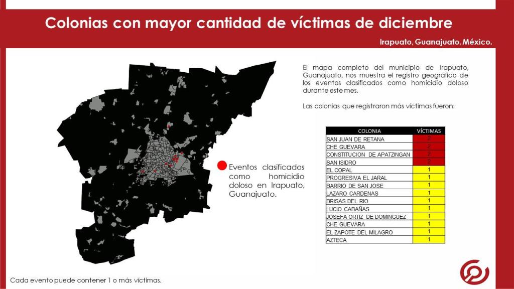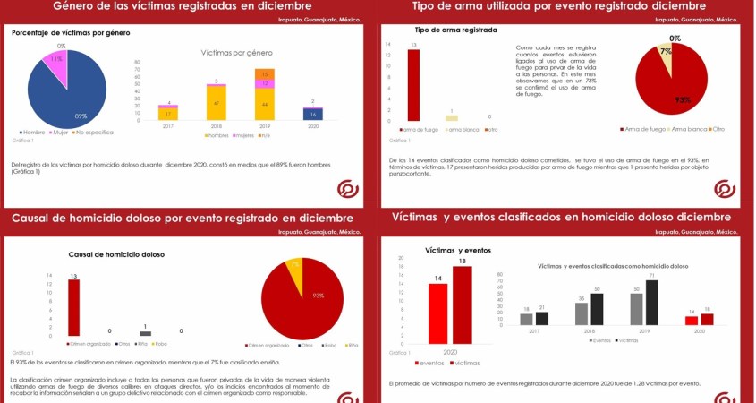 El reporte mensual de víctimas por homicidio doloso presenta la información condensada del registro de víctimas y eventos acontecidos en el municipio de Irapuato, Guanajuato.