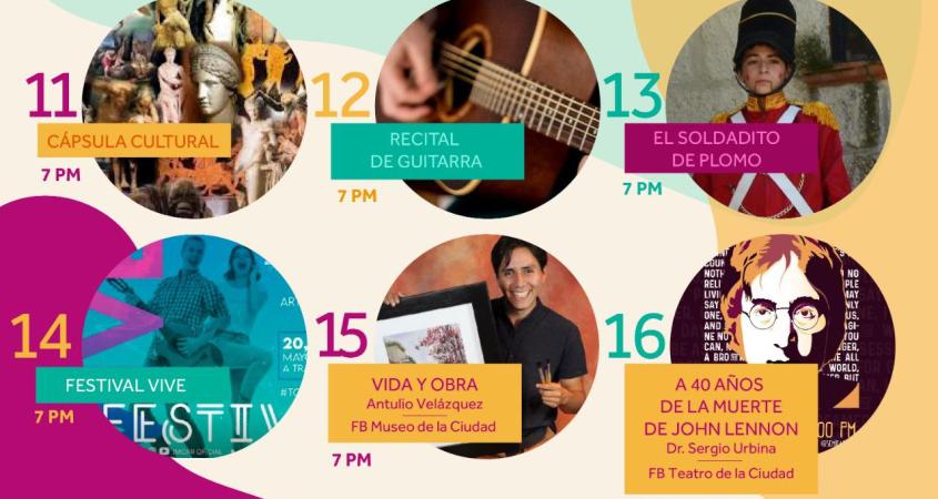 El viernes 15 de enero, se contará con la transmisión de ‘Vida y Obra’, de Antulio Velázquez, a través de la página del Museo de la Ciudad y, el sábado 16 se transmitirá la charla: ‘A 40 años de la muerte de John Lennon’, por el facebook del Teatro de la Ciudad.