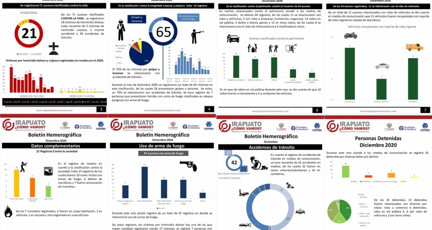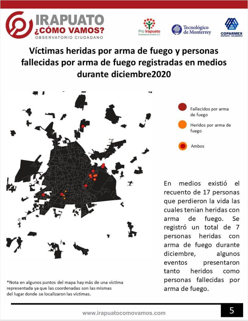 Durante este mes existió registro de un total de 47 registros en donde se relacionó el uso de armas de fuego. De estos registros, las víctimas por homicidio doloso fue una de las que mayor cantidad registraron siendo 17 víctimas, se registró 7 personas con lesiones producidas por arma de fuego, 10 registros relacionados con robos, 10 con la portación ilegal y disparos con arma de fuego, hubo recuento de 3 sucesos más donde estuvo presente arma de fuego.
