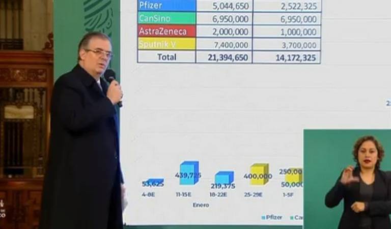 Ebrard agregó que del 25 al 29 de enero llegarán 400.000 dosis; mientras que entre el 1 y el 26 de febrero los lotes que arribarán serán de 250.000 vacunas semanales y, a partir de marzo, los lotes serán de 1.2 millones de dosis por semana.