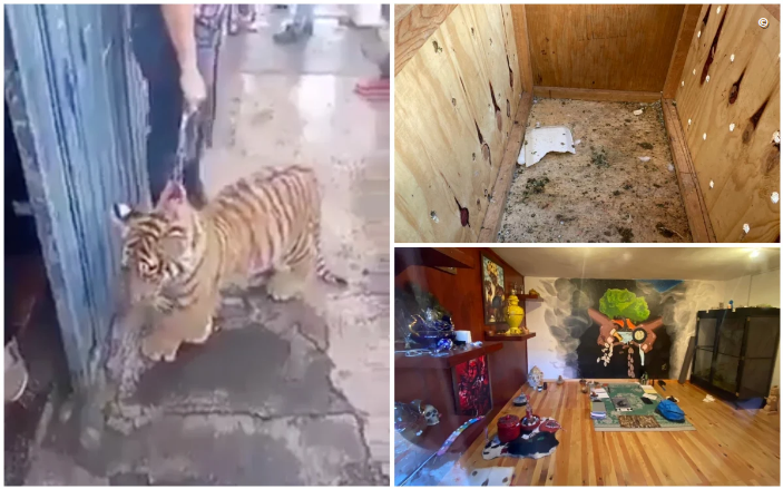 En el sitio había dos habitaciones, en la primera se encontraba un refrigerador con carne y desechos, probablemente utilizados para alimentar al tigre; además encontraron una jaula con restos de pelaje que coinciden con las características del animal.