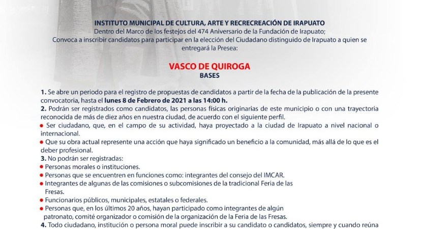 A través de las redes sociales del Instituto Municipal de Cultura, Arte y Recreación (IMCAR), se puede consultar la convocatoria para participar e inscribir a aquel irapuatense destacado por su labor social y que pueda ser acreedor de la presea Vasco de Quiroga 2021.