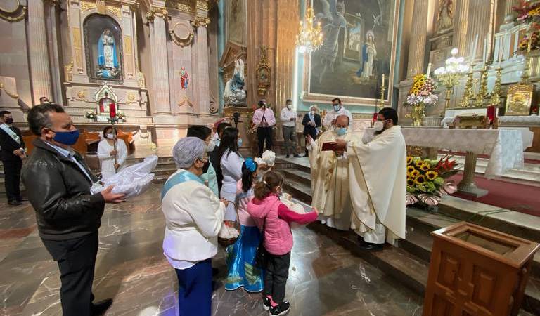 En la misa, donde se contó únicamente con tres sacerdotes y miembros de grupos religiosos, se pidió por los enfermos de Covid-19, y la salud de los enfermos, se transmitió a través de redes sociales la misa, y se dio la bendición para las imágenes de Niño Dios que se realiza año con año, asimismo hizo una bendición importante para los niños de carne y hueso que hay en el municipio para los que se realizó una oración especial.