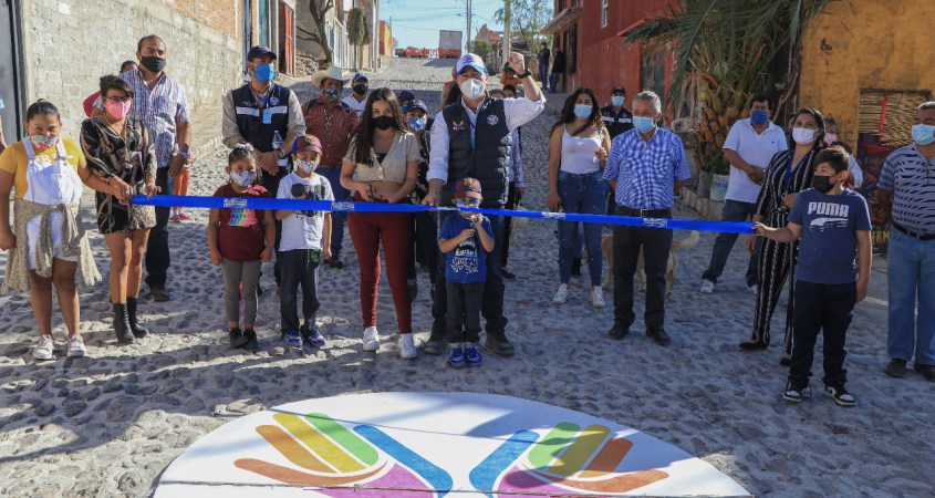 Además, se pavimentaron 1,701 metros cuadrados del arroyo vehicular con piedra bola asentada en cemento y la construcción de las guarniciones en concreto, así como las banquetas de un ancho promedio de 1.20 metros en adoquín.