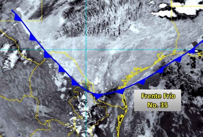Por la noche y madrugada del viernes, la masa de aire polar que impulsa al Frente Frío número 35 originará un marcado descenso de la temperatura, nieblas en el norte y noreste del territorio nacional, así como evento de Norte muy fuerte con rachas de 60 a 70 kilómetros por hora en el litoral de Tamaulipas y el norte de Veracruz.