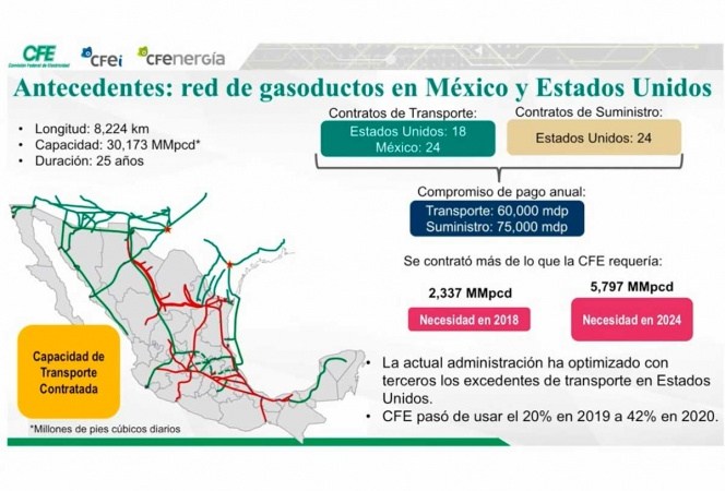 Detalló que durante los dos gobiernos federales pasados se hicieron contratos de una red de gasoductos privada: en materia de transporte son 18 en Estados Unidos y 24 en México; en suministro, son 24 en la nación vecina.