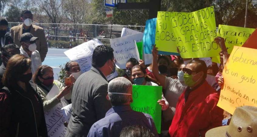 Desde su llegada de ambos gobernantes a la Unidad Deportiva Sur ‘Luis H. Ducoint’ para el cierre de la gira de trabajo, al menos medio centenar de personas en su mayoría mujeres se congregaron alrededor de ellos para mostrarles su apoyo, con gritos y pancartas en mano.