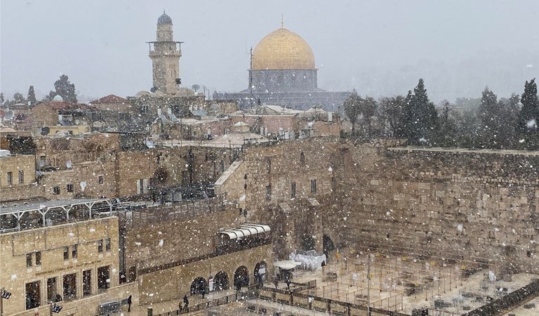 Jerusalén amaneció cubierta de blanco tras una tormenta de nieve que comenzó el miércoles por la noche y obligó a las autoridades a cerrar el transporte público y bloquear los accesos a la ciudad.