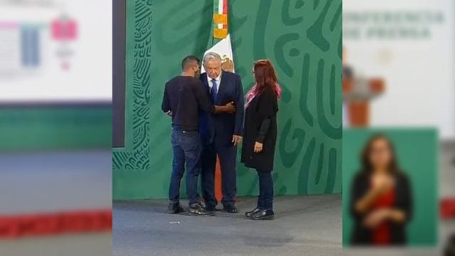 Un joven de 31 años burló la seguridad de Presidencia y se coló hasta el escenario principal de la “mañanera” para entablar un diálogo de segundos con el presidente Andrés Manuel López Obrador, tras lo cual fue retirado por personal de Atención Ciudadana.